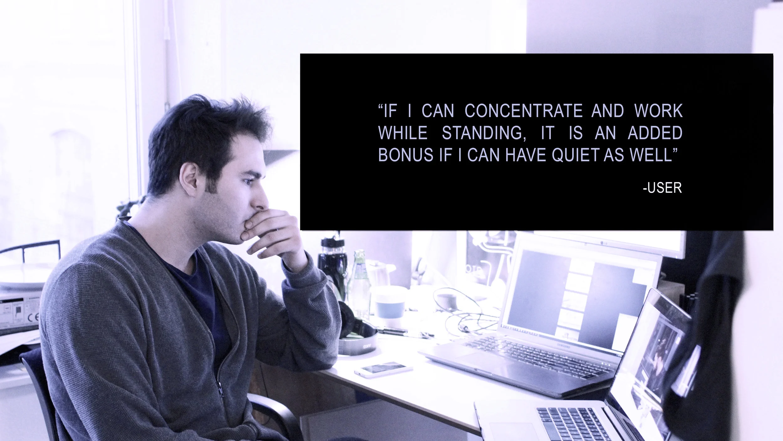 We decided to make lo-fi video prototypes to test with users. We received feedback that having a quiet zone is a positive incentive for using your standing desk. Users reported that having a quiet space, while being away of all the things in the office as an added bonus.